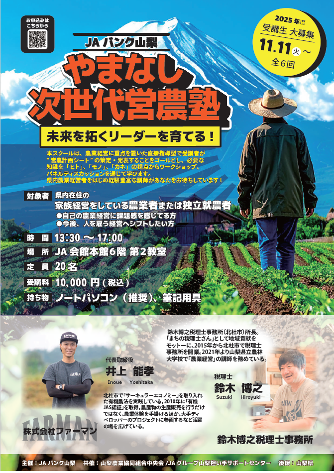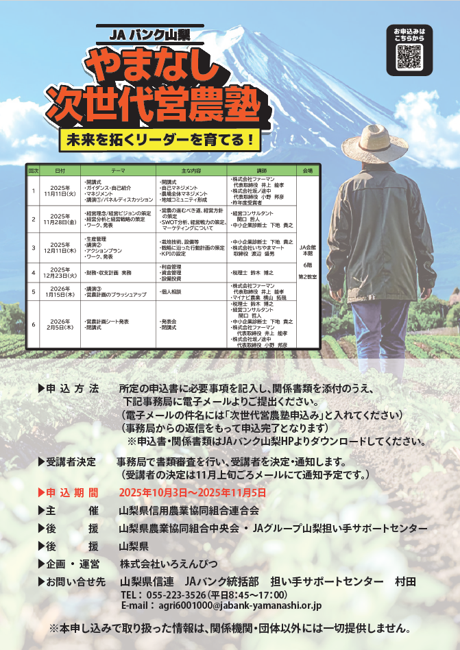 JAバンク山梨(担い手サポートセンター)では、2025年度の「やまなし次世代営農塾」の参加者を募集しています。 <申込期間10月3日(金)~11月5日(水)>